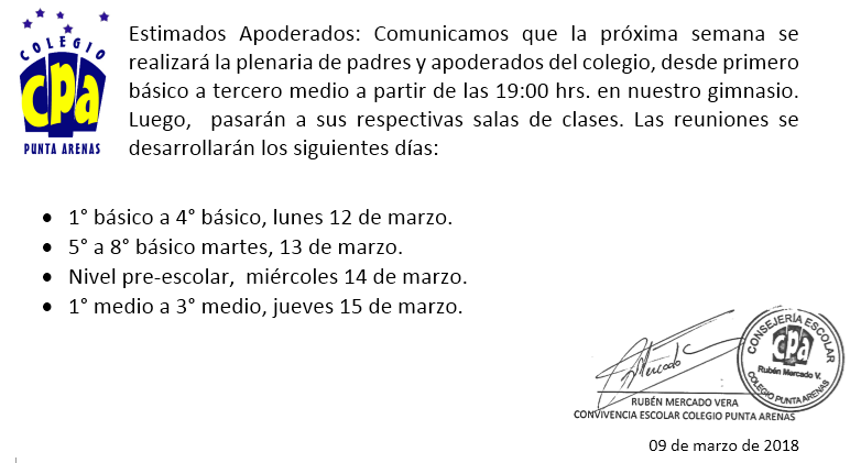 Ponemos a disposición de toda la Comunidad Educativa del Colegio Punta Arenas, el Calendario de Pruebas correspondiente al 1° semestre lectivo del año 2018, en todos los niveles del establecimiento.Es importante considerar que estos calendarios se presentan como una herramienta de gran ayuda para la planificación tanto de los cursos como del estudio personal; entendiendo que necesitamos formar un hábito en torno al estudio diario y sistemático como clave fundamental para aprendizajes perdurables en el tiempo y con calidad efectiva.Cada calendario, se ha construido de acuerdo a los criterios establecidos en los Reglamentos de Evaluación y Promoción 2018, los cuales cuentan con algunas innovaciones y cambios respecto a los vigentes hasta el año pasado -en concordancia también con lo que ha sido nuestro giro institucional-. Quienes no los conocen todavía, pueden consultarlos y descargarlos en este mismo sitio web.Los calendarios, no pueden ser modificados a contar de la presente fecha de publicación -a menos que se trate de una situación imponderable, como por ejemplo una suspensión de clases no prevista o una ausencia Docente-. Lo que sí podría cambiar por motivos pedagógicos justificados, es la ponderación de una prueba (cambiar una Coeficiente 1 por Coef. 2 y vice-versa).Finalmente me permito recordar que con respecto a la programación de pruebas atrasadas, los Docentes están facultados para fijar las pruebas atrasadas a los alumnos cuando estos no deben más de tres evaluaciones y cuidando la aplicación de los criterios de tiempo y preparación cuando el motivo de la ausencia se considera como «justificación válida para efectos académicos: Certificado o Licencia Médica; enfermedad grave o fallecimiento de familiar directo; situaciones familiares delicadas que pueden implicar ausencia a clases o incluso viajes; Participación o representación avalada por la Ley del Deporte». Esto significa que ya no pasarán por UTP todas las recalendarizaciones de pruebas, sino solamente las de aquellos estudiantes que deben más de tres evaluaciones por motivos debidamente justificados.En el caso de inasistencias por otros motivos -viajes, vacaciones fuera de las fechas oficiales del calendario escolar o similares- , los Profesores podrán comenzar a aplicar las pruebas en cuanto el estudiante se reintegra a clases.Todo este proceso, tiene como meta, el mejoramiento continuo y sistemático tanto de los Aprendizajes de cada estudiante, el refuerzo de los hábitos de estudio, asistencia y responsabilidad, y el fortalecimiento de nuestra propuesta pedagógica como Colegio Punta Arenas.