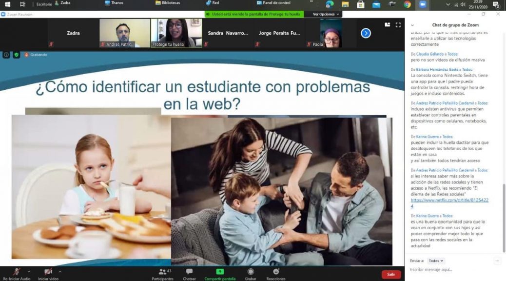 El equipo nacional de «Protege tu huella», entregó una charla y capacitación a los padres, apoderados, docentes, paradocentes y directivos del Colegio, con relación a los cuidados de la «huella digital» que vamos dejando en el mundo de la internet y también sobre Los niños en la web, peligros y cómo prevenir.