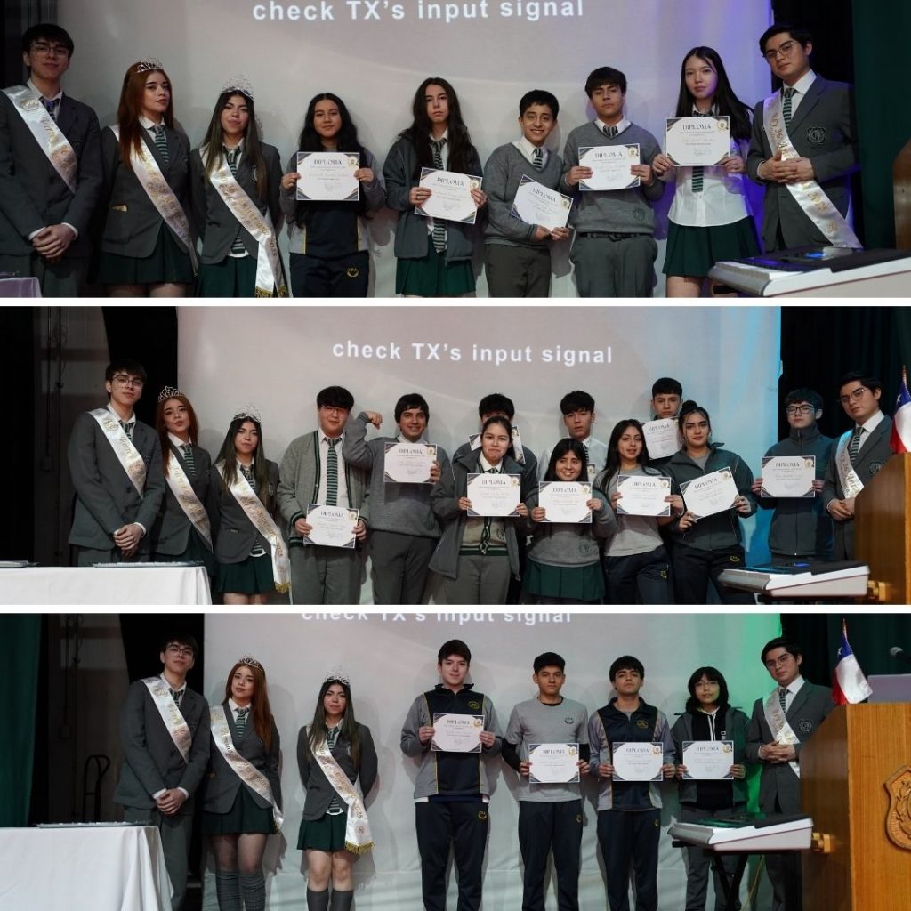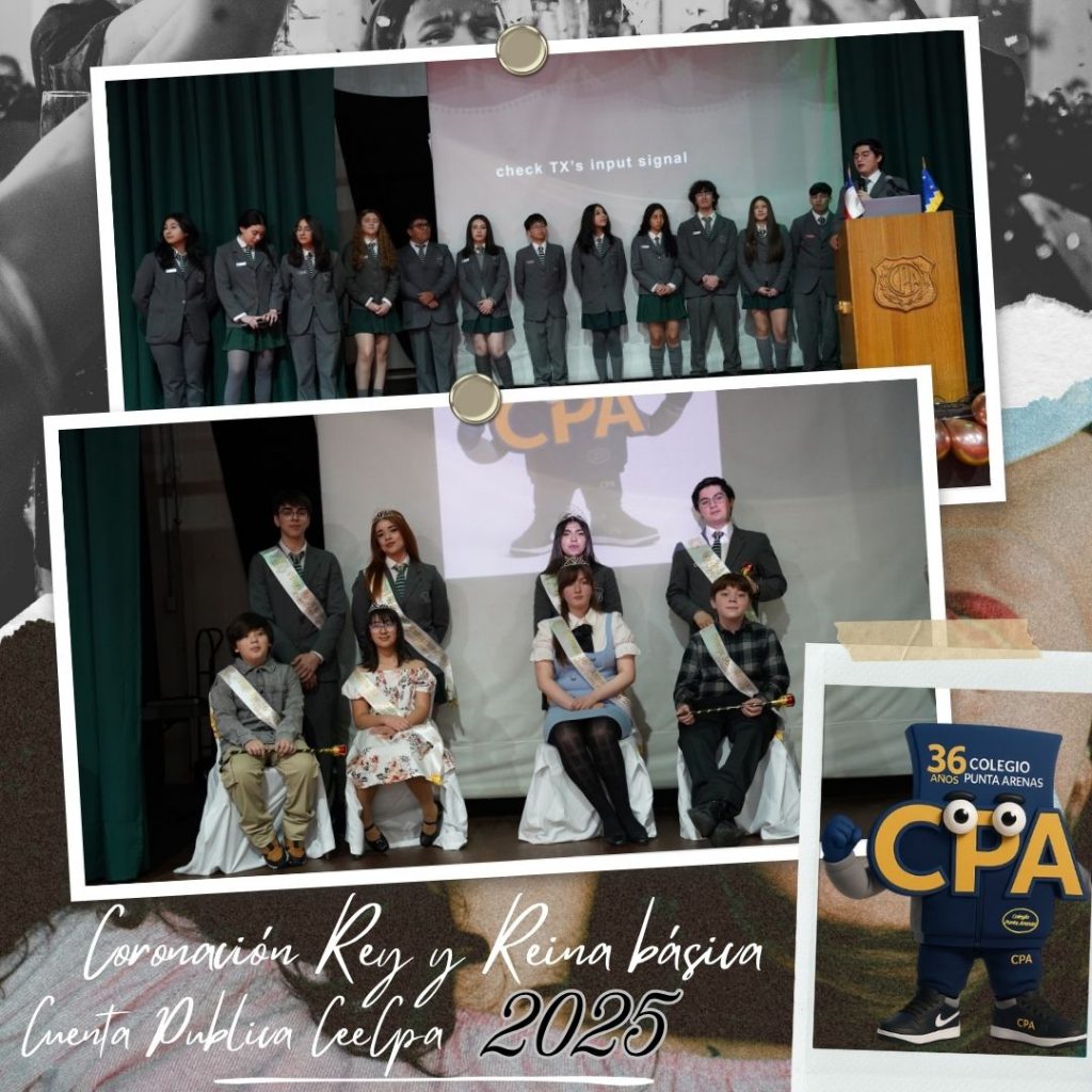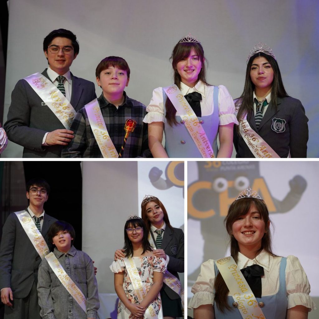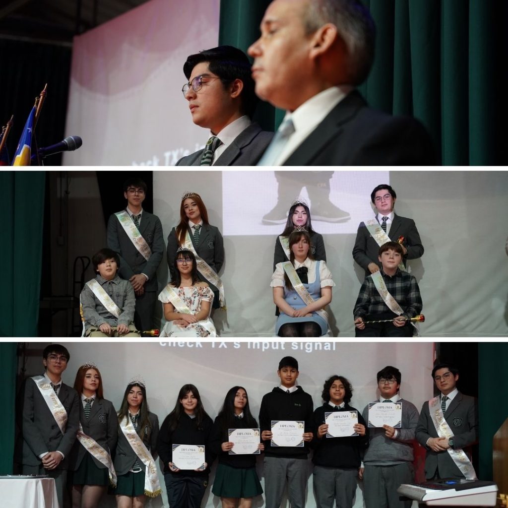 Acto de Coronación – Enseñanza Básica Con mucha alegría y emoción, se coronó a los Príncipes de Enseñanza Básica en una ceremonia simbólica y participativa. La música en saxofón de Mía Vergara Silva acompañó este momento especial. La alianza ganadora fue Japón. Los nuevos príncipes: Josefina Torres, Sebastián Hurtado, Sofía Williams y Jhonas Martinic. Coronan: nuestros reyes de E. Media, Bastián, Agustina, Lukas y Valentina.