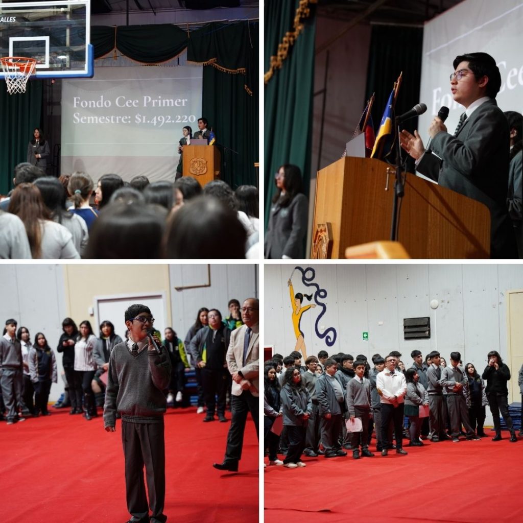 Cuenta Pública del Centro de Estudiantes El CEE, representado por su presidente Bastián Sanhueza y las tesoreras Macarena Donoso y Emilia Cáceres, presentó con transparencia y responsabilidad el balance de ingresos ante estudiantes de 7° a 4° Medio. ¡Felicitaciones por su liderazgo y compromiso con la comunidad escolar!